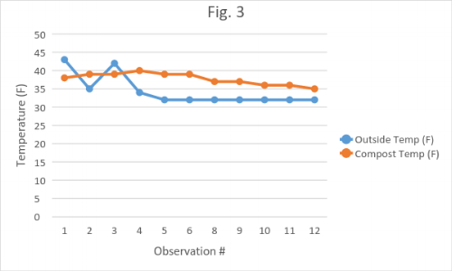 Not to be outdone by a small flood of water leaking into my case, I put the sensor in a plastic freezer bag and put the setup in my home compost pile to get some temperature data and see if the sensor could broadcast through a pile of rotting food. The results are in the below table and Fig. 3.