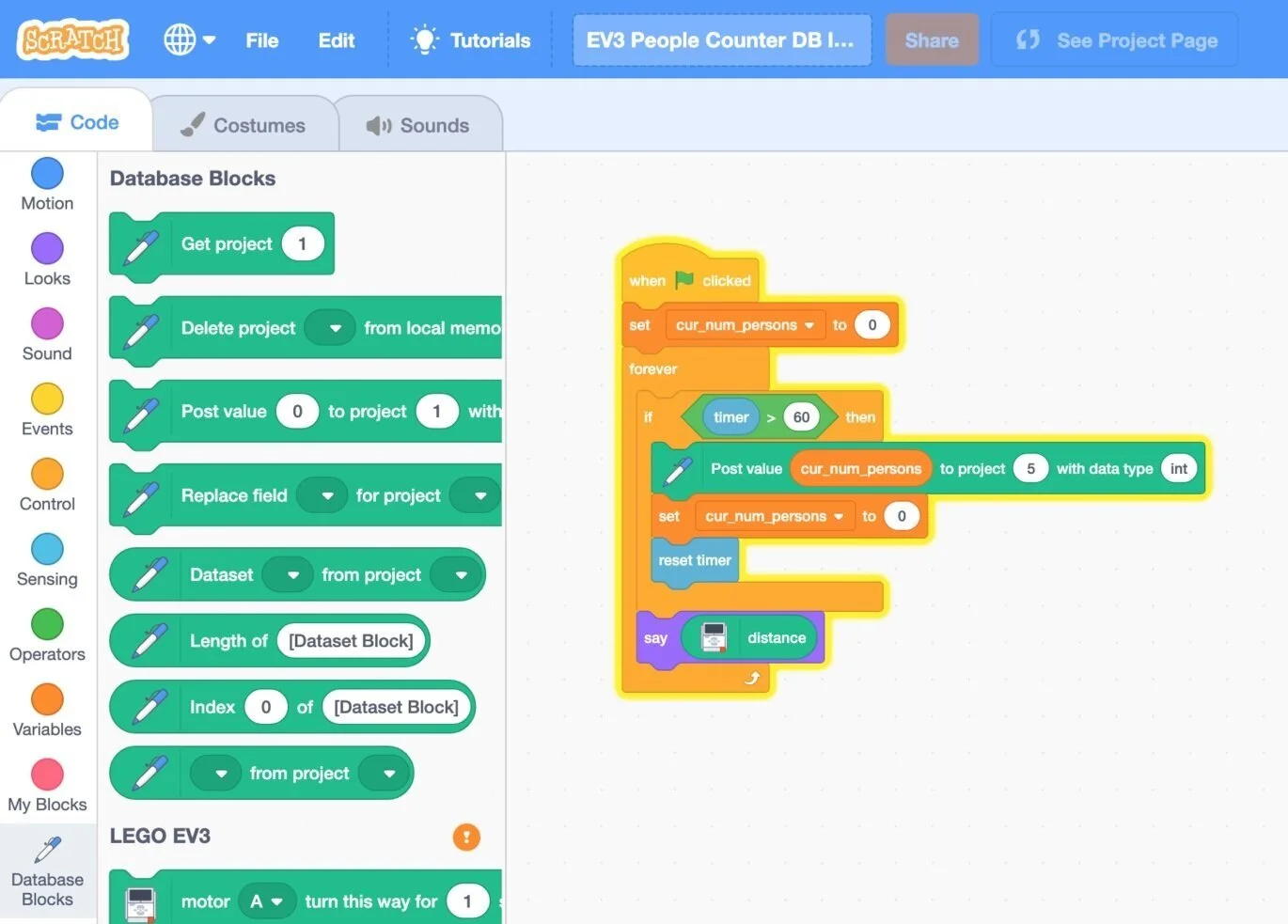 Our custom Scratch extension and data-tracking web page.